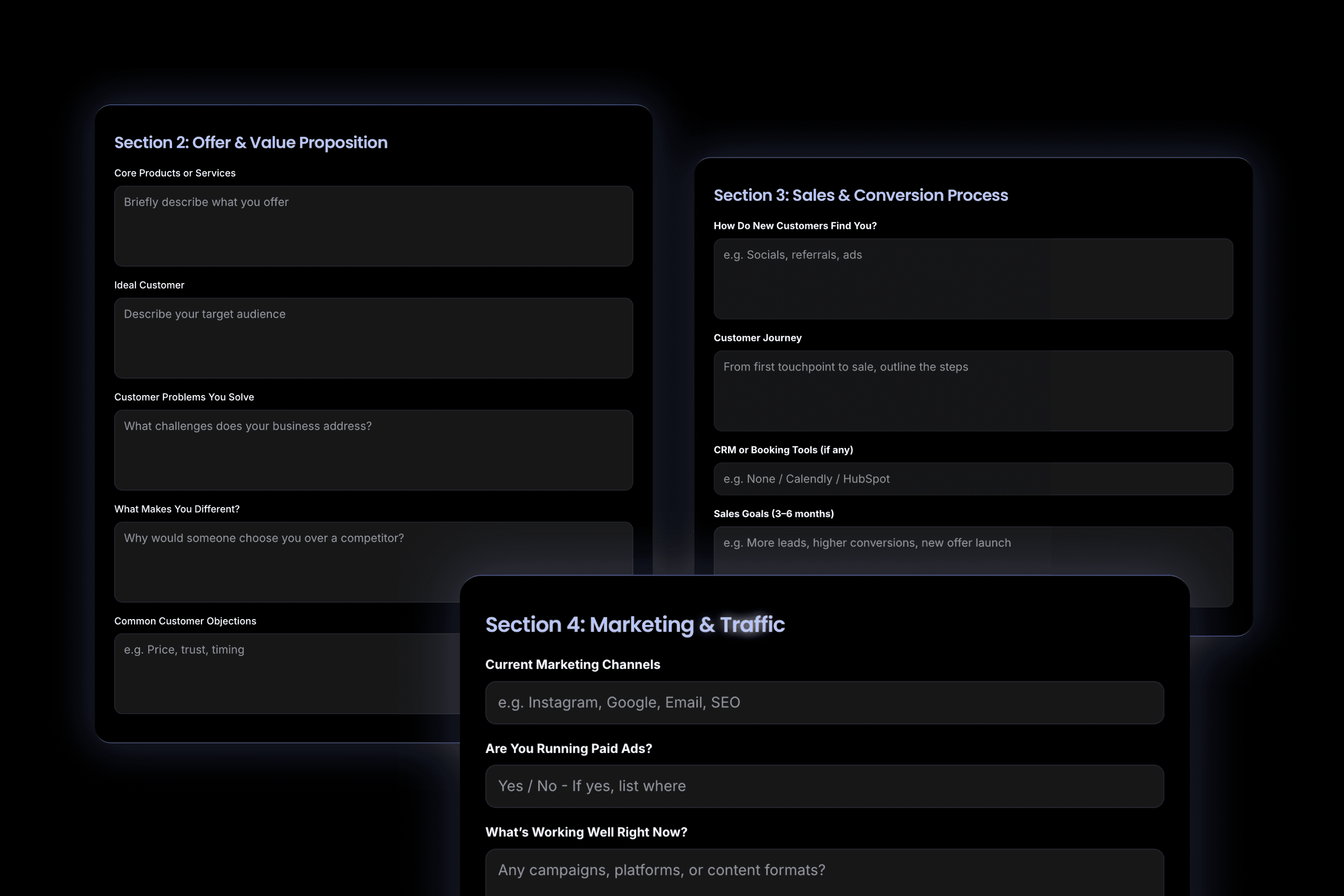 We pre‑fill your onboarding form based on earlier conversations, then refine it live — capturing your unique value proposition, target audience, and competitive position.